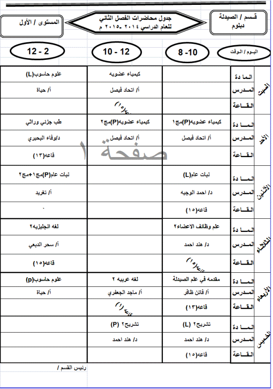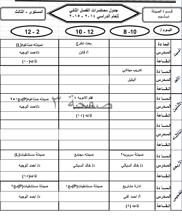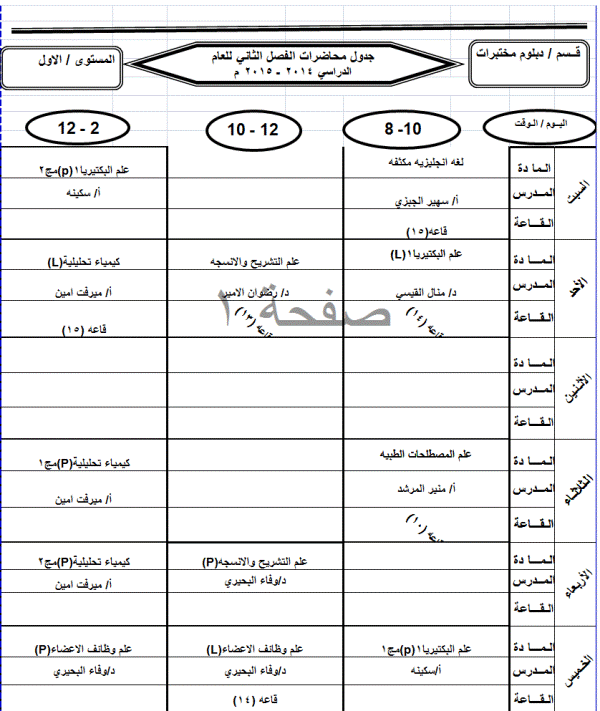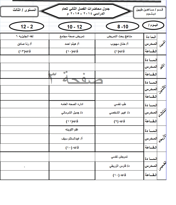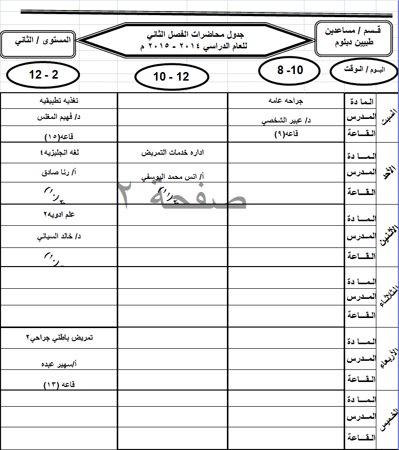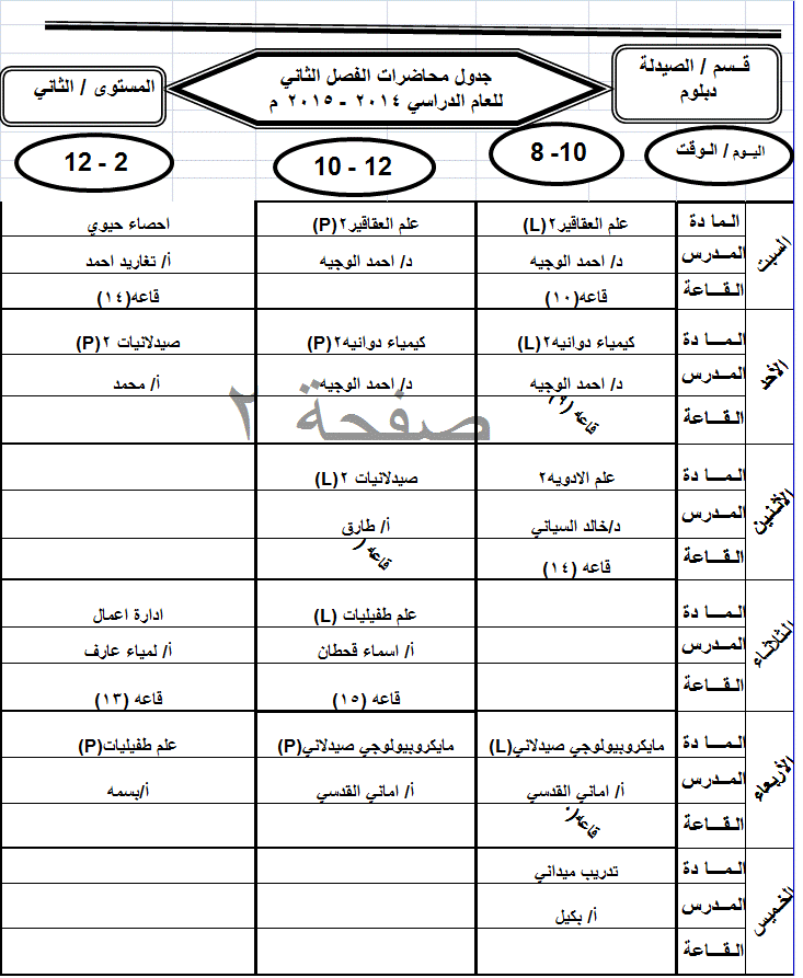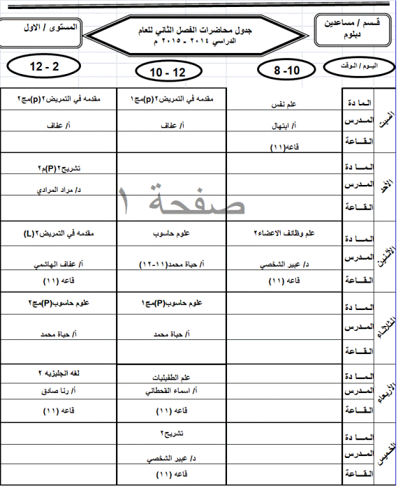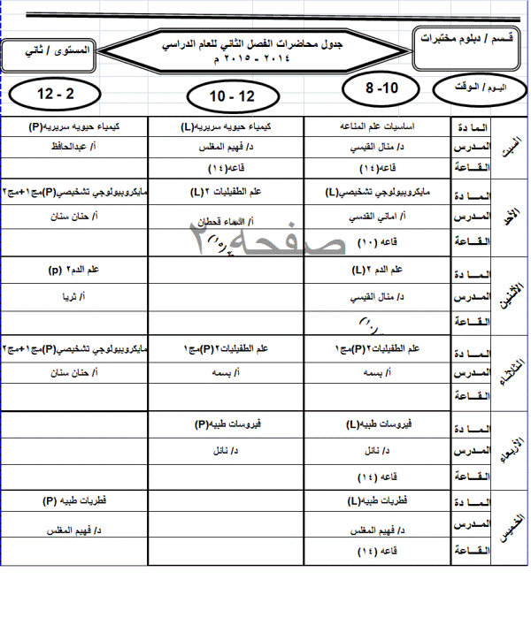 جدول الدبلوم الفصل الثاني للعام الجامعي 2014-2015م